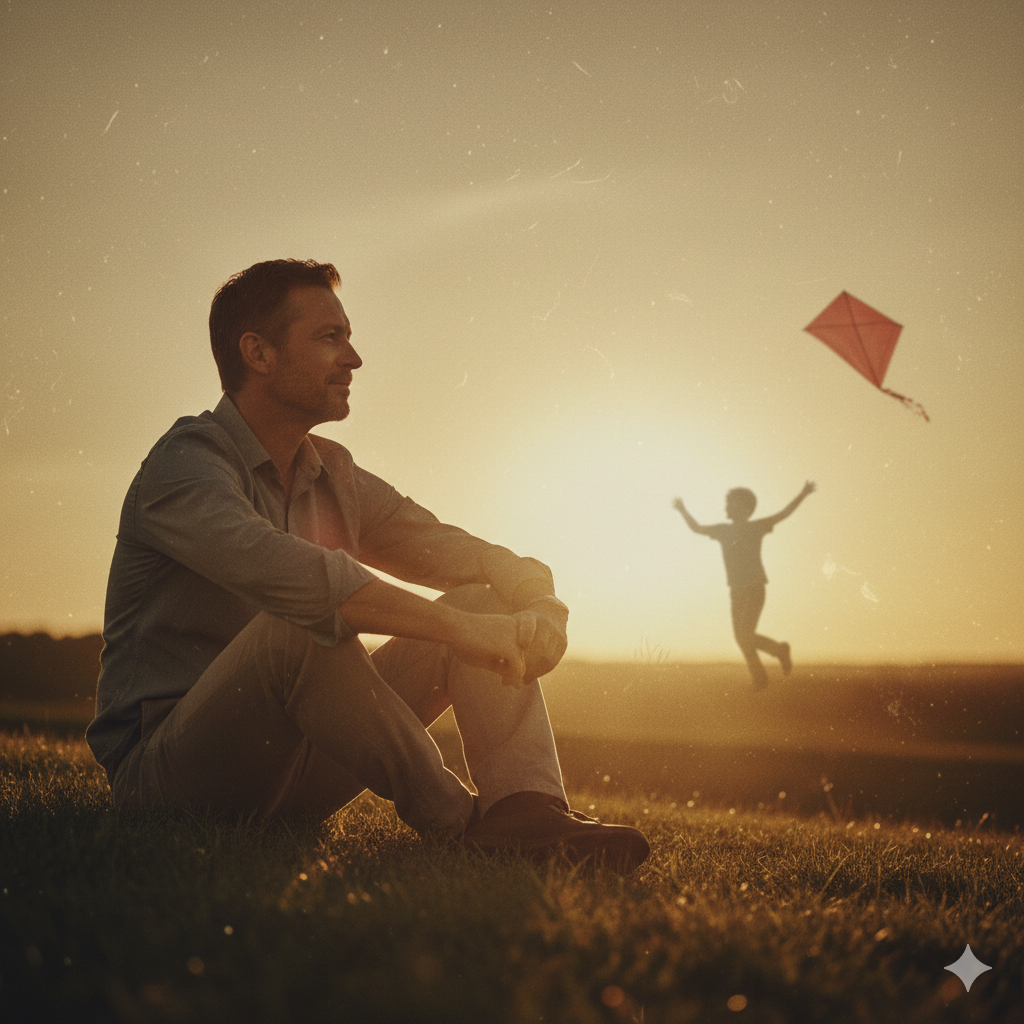 Na pierwszym planie, w dolnej części kadru, siedzi na trawie mężczyzna w wieku około 40 lat, ubrany w swobodną koszulę i jasne spodnie. Jego sylwetka jest wyraźna, a twarz oświetlona ciepłym, złotym światłem zachodzącego słońca. Mężczyzna ma lekko uniesioną głowę i delikatny uśmiech, zamyślony patrzy w prawą stronę kadru, w dal. Jego poza jest zrelaksowana, ręce spoczywają na złączonych kolanach. Trawa wokół niego jest soczysta i zielona, z widocznymi pojedynczymi źdźbłami. W tle, nieco rozmyta i w mniejszej skali, widoczna jest sylwetka dziecka (chłopca) biegnącego radośnie po polu z rozłożonymi ramionami, puszczającego czerwony latawiec. Latawiec unosi się wysoko na tle jasnego, pomarańczowo-złotego nieba. Całość kadru jest skąpana w miękkim, nostalgicznym świetle zachodzącego słońca, tworzącym długie cienie i dodającym scenie ciepła. Obraz ma delikatny efekt ziarna i winiety, co wzmacnia wrażenie starych wspomnień i nostalgii.
